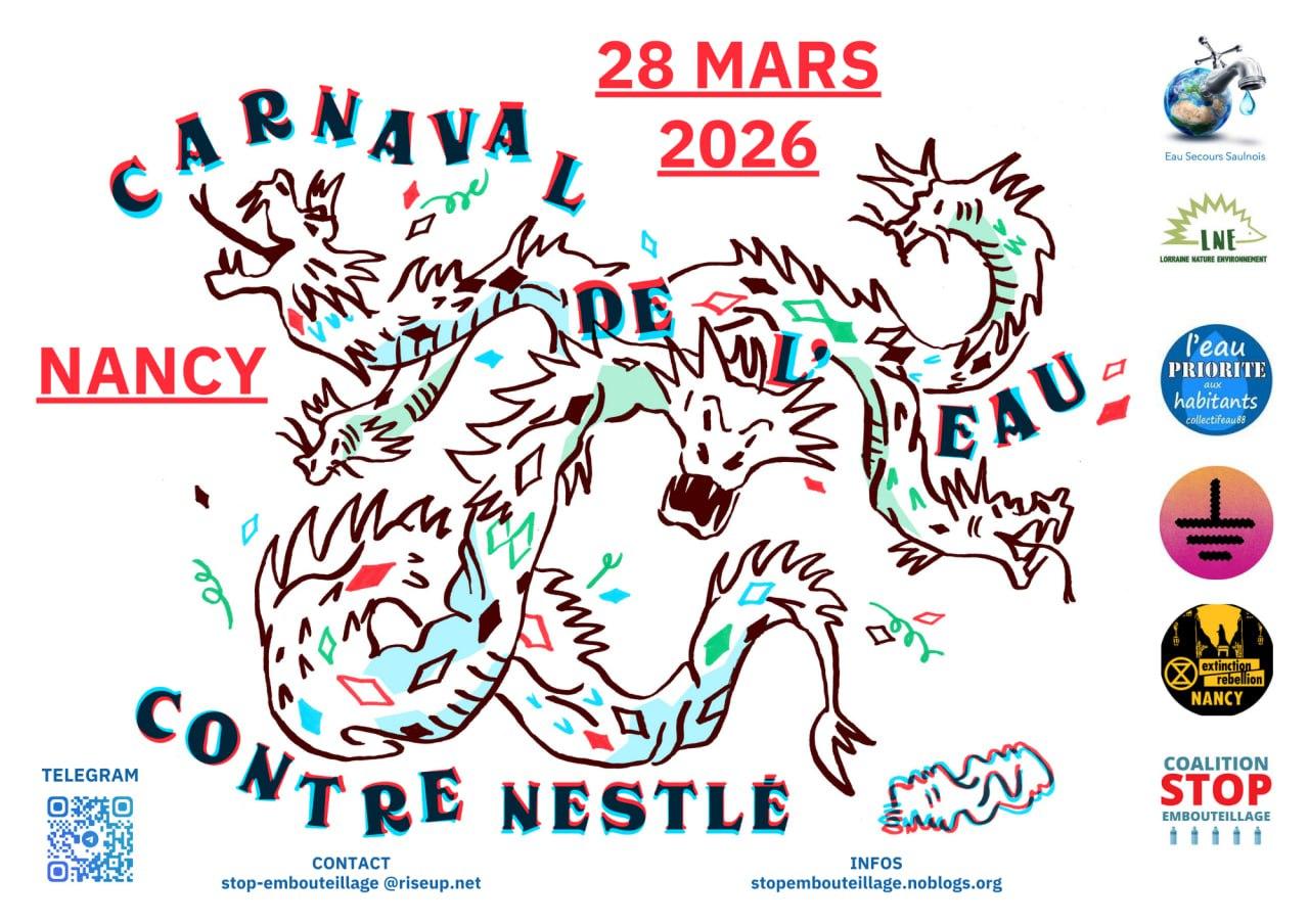 Du 23 au 27 mars 2026, Nestlé sera en procès à Nancy pour l’affaire des décharges plastiques irrégulières autour de Vittel. Afin de soutenir les équipes juridiques de Lorraine Nature Environnement, France Nature Environnement et du collectif EAU 88, la coalition STOP EMBOUTEILLAGE a décidé de marquer le coup en organisant un GRAND CARNAVAL POUR L’EAU CONTRE NESTLE ET SON MONDE le samedi 28 mars, avec le soutien de XR Nancy et des Soulèvements de la Terre 54. À l’inverse de l’univers toxique et morose de Nestlé, ce carnaval sera résolument festif, populaire et déterminé à rappeler que l’eau est un commun inaliénable !